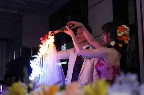 披露宴の中では、幻想的な光を放つ「フェアリーイリュージョン」を行いました♪ 何がおこるのかゲストの皆様もわくわくで、お二人がお水を注ぎ、きらびやかに光った時には「わぁー!!」と大きな歓声が上がりました!