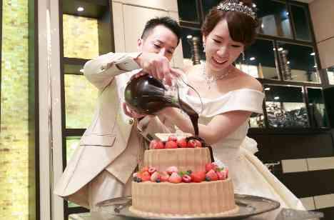 続いてはパーティへ。おふたりとも野球が大好きとのことから、席札は硬式ボール。さらにウエディングケーキは、チョコレートが大好きなご新婦様たってのご希望で、チョコレートをドリップしておふたりでデコレーション♪