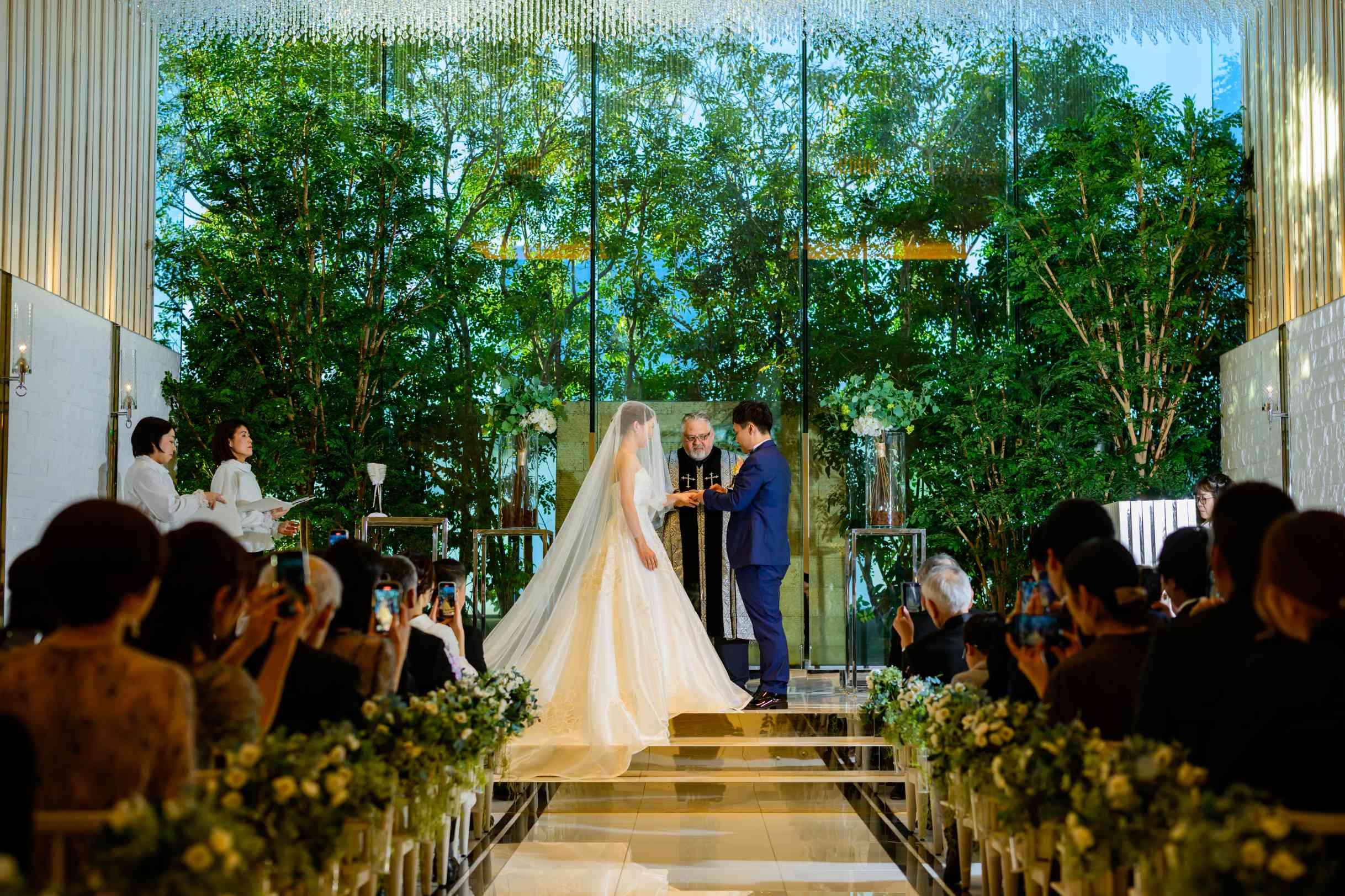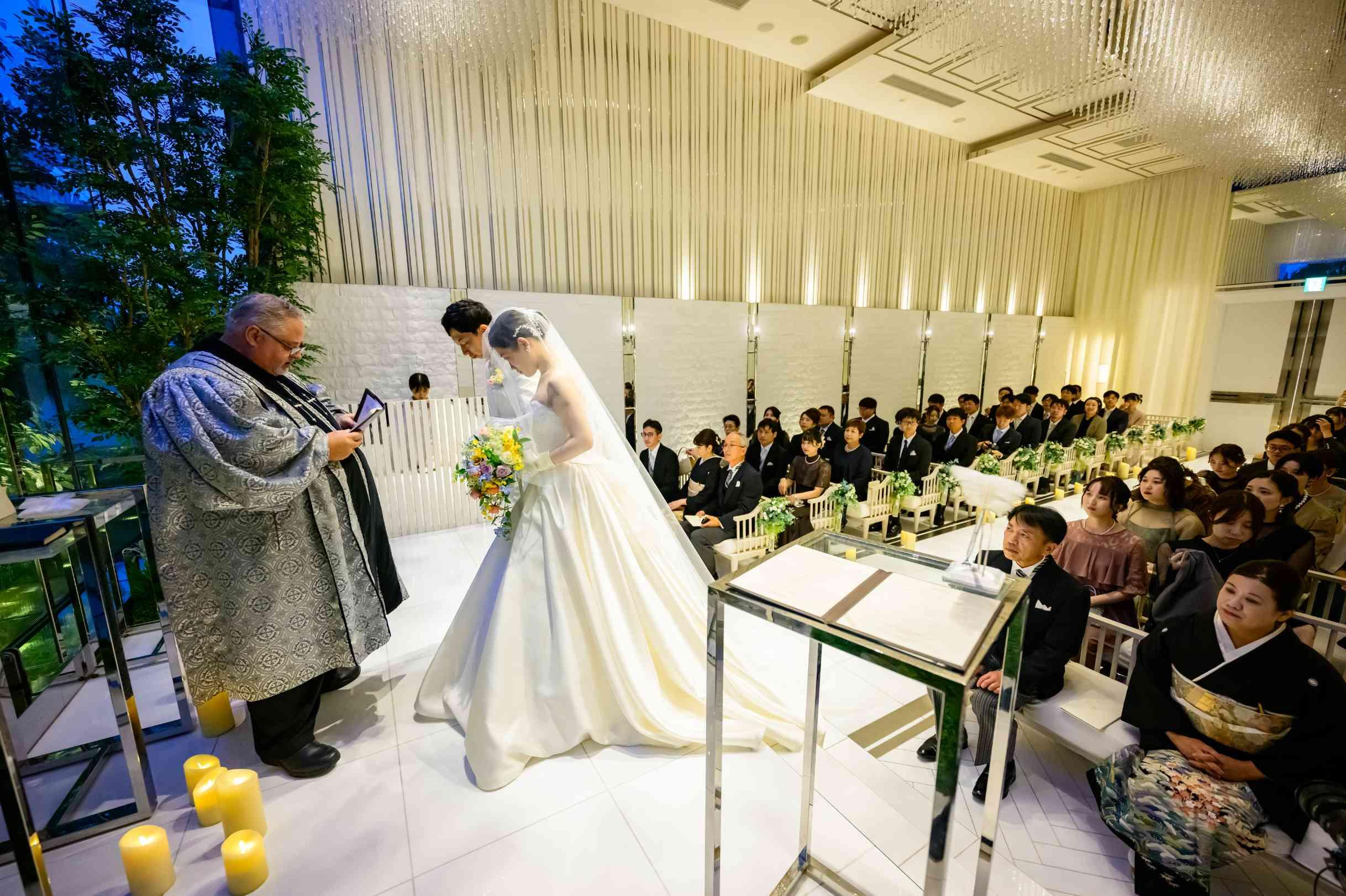 純白のチャペルに降り注ぐ自然光にクリスタルが美しく煌めき、花嫁のドレス姿をより一層輝かせる。チャペル装飾のバリエーション豊富で可愛らしい雰囲気にも出来る。最上階に位置するチャペルなので雨天時も明るい。