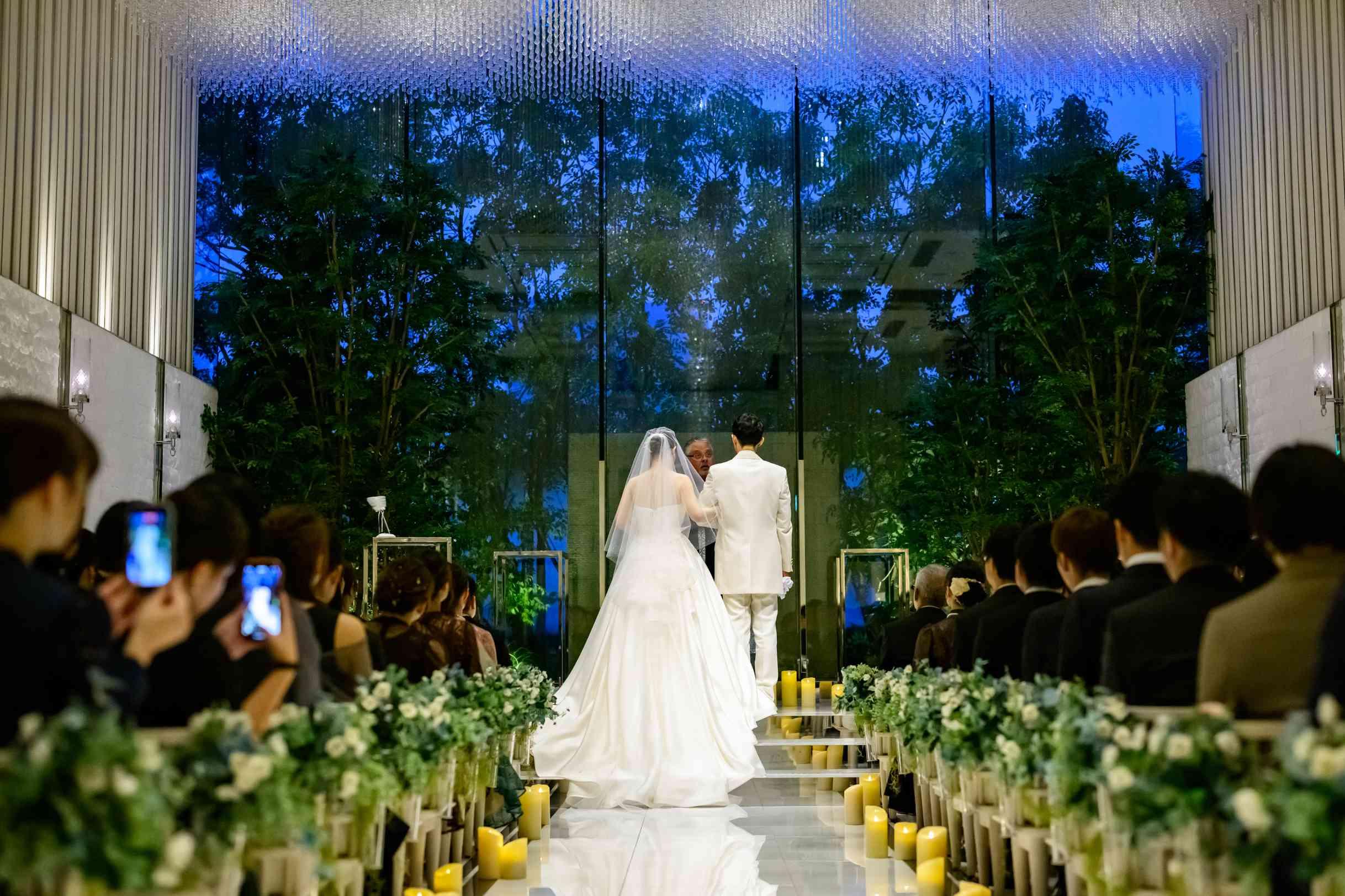 昼間とは一気に雰囲気を変えた、バージンロードをたくさんのキャンドルで飾ってロマンチックな雰囲気の夜の挙式も人気。大理石のバージンロードにキャンドルの灯りが美しく輝く。