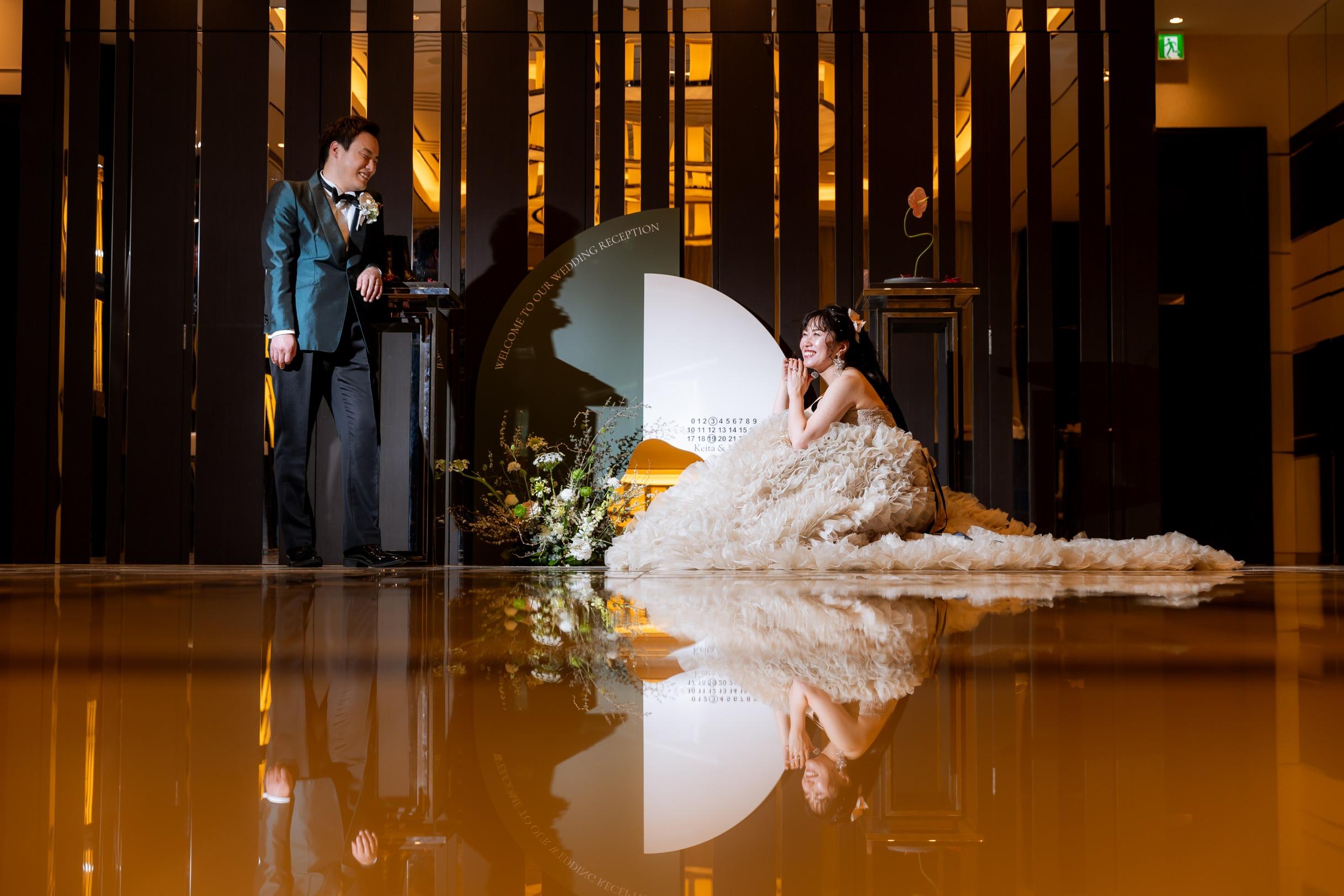 表参道からすぐの好立地、大通りから一本入った静かな場所に佇むシャルマンシーナ東京。エントランスロビーは一歩足を踏み入れると、まるでホテルのようなゴージャス感。シャルマンシーナ花嫁に人気の前撮りスポット