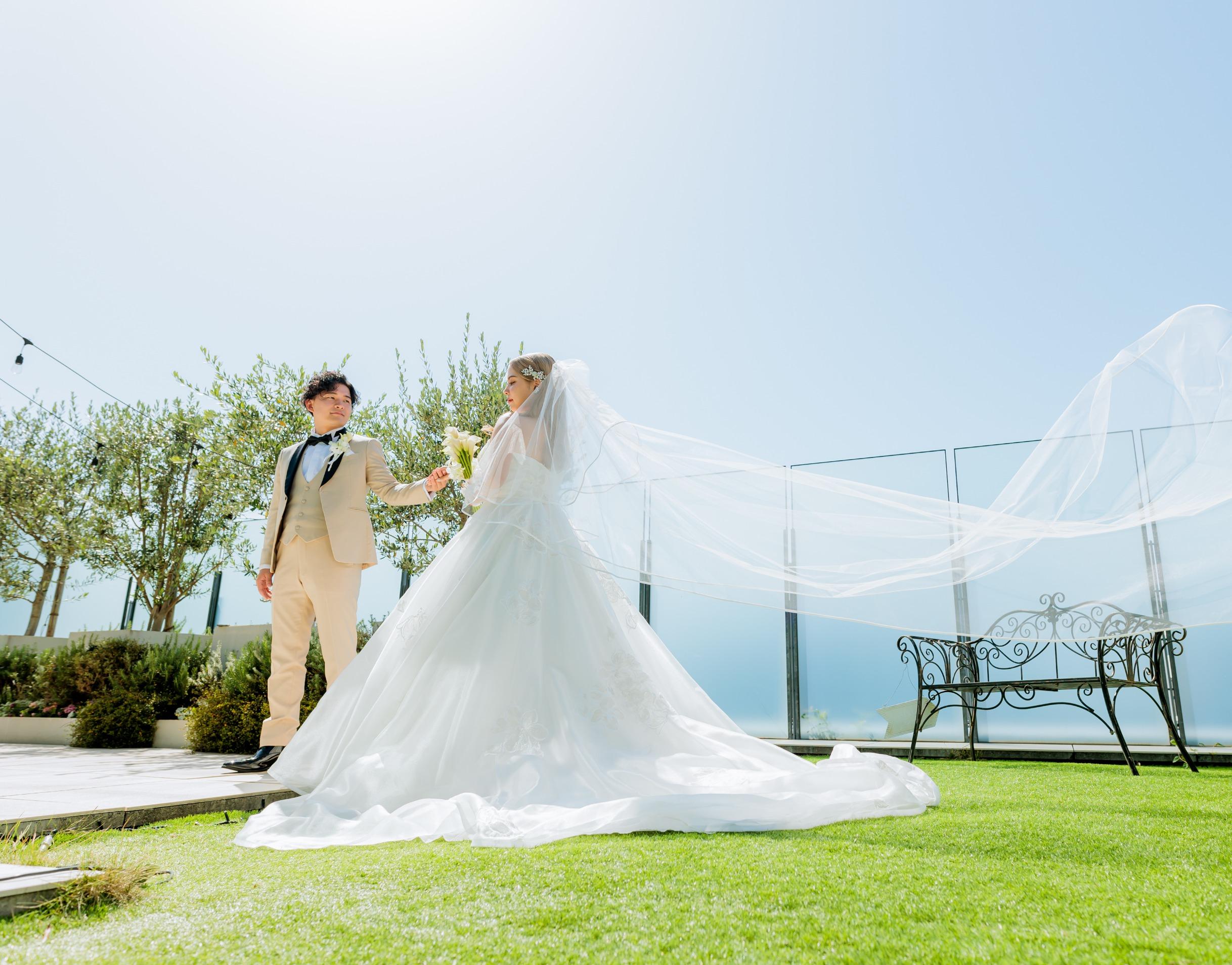 【ノヴェルクリスタル】テラスはウェルカムパーティやデザートビュッフェなど、ゲストと近い距離でふれあう時間にぴったり。風を感じながら開放感抜群でゲストもおふたりも自然体に過ごせるのが嬉しい。
