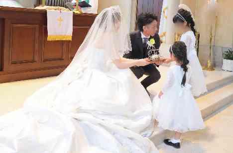 一生に一度の晴れの日の大切な衣装。新婦様ウエディングドレスをすごく悩まれて、何十着も試着をされていました。そして見つけた運命の1着。とってもお似合いで素敵で誰よりもキレイな新婦様。そんな中指輪交換の際に、新婦様に匹敵する可愛いリングガールが登場!!お揃いのドレスとお揃いの髪型で、緊張しながらも一生懸命大好きなおふたりに届けます。おふたりはもちろん、ゲストの皆様も満面の笑みを浮かべる瞬間でした。