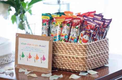 人気の演出である、ドレスの色当てクイズ。 おふたりはその投票アイテムにうまい棒をご選択されました。 味に合わせて沢山のカラーリングがあるうまい棒。 「みんな分からないと思うし、あんまり人気なさそうな味だから当たらない自信ある!」とお話されていたおふたりでしたが、予想は当たらず、正解の色が一番人気!皆様、新婦様が好きなお色を覚えてらしたそうです。ご家族からおふたりへの愛が感じられる場面でした。