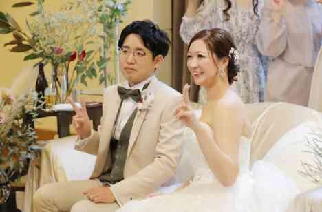 お酒が大好きなおふたりは行きつけのお店で出会われたそうです。同じ場所で仲良くなったご友人もご招待されており、周りの皆様もお酒が大好きな方ばかり。そんなおふたりは披露宴はアットホームでみんな一緒にお酒を飲んでお話をして写真を撮ってとゆっくりお楽しみいただける時間にしたいと考えられました。アットホームな空間になるよう、メインはソファに。そして段差は設けず、ゲストの皆様と同じ目線でお過ごしになりました。