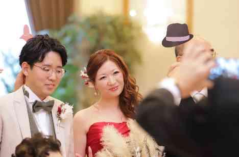 唯一おふたりがご希望された演出は「テーブルフォトラウンド」でした。おふたりの為に集まってくださった皆様に感謝のお気持ちを伝えつつ、乾杯しつつ、皆様のお席を順番に回られました。お写真撮影の際にはおふたりご準備のフォトプロップスを皆様にご使用いただきました。ゲストの皆様のことを想いながら各卓違うものでご用意されており、よりアットホームで笑顔いっぱいのお写真を撮っていただけました。