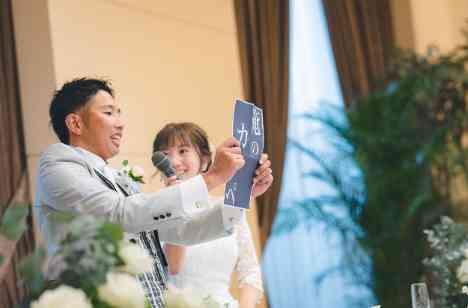 いつも笑顔いっぱいで場を和ませてくださる新郎様。そんな新郎様がきっとまだ緊張されているであろうゲストの皆様を想い、考えられた演出。「俺のカンペ」と大きく書かれたカンペを読みながらのご挨拶でした。内ポケットから勢いよく出てきたカンペに皆様はクスっと笑顔に。新郎様も緊張しているであろう中、いつも以上の笑顔で周りの皆様をも笑顔にしてくださいました。
