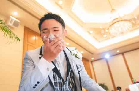 大人気の演出であるケーキ入刀&ファーストバイト。ここでも皆様を笑顔にさせる演出を考えていらした新郎様。当日はコンタクトでしたが、普段は眼鏡の新郎様。ファーストバイトで特大ビックスプーンが出てくると同時に普段の眼鏡を掛け、顔面一杯にケーキを!眼鏡にケーキがついて見えない~!と盛り上げて下さいました。新婦様の愛情いっぱいのケーキをたくさん受け止めて一番の笑顔を見せて下さいました。