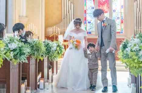 可愛いお子様がいらっしゃるおふたり。できるだけ一緒に式に参加してほしいという想いもあり、「人前式」というスタイルをお選びになりました。リングボーイや退場後のバブルシャワーでご活躍いただき、誓いのキスやご退場も家族3人で行われました。 見守ってくださるご親族も3人のかわいらしさに笑顔が溢れる素敵な式となりました。