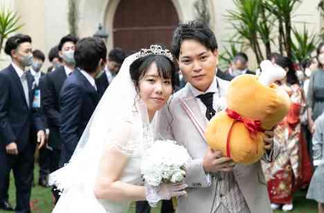 大切なゲストの皆様に囲まれ、温かな挙式を行われたおふたり。挙式の後はガーデンにて皆様からのフラワーシャワーをいただき、その後はセレモニーを行いました。新婦様はかわいらしいブーケをご用意されトスを。新郎様はお肉クッションを使ったお肉トスを!見事キャッチした方にはお肉ギフトのプレゼント。可愛いリボンが結ばれた大きなお肉に皆様びっくり!楽しいお時間をお過ごしいただきました。