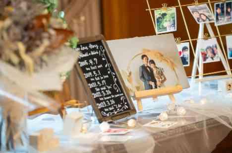 学生の頃からの同級生だったおふたり。気心の知れた友人として仲良くしているうちに運命の相手はこの人だとお互いに思われたとの事。出会いからの思い出が沢山あるおふたりは「Love story」と題しふたりの年表とたくさんのお写真をご用意をされました。 また、学校の先生である新婦様は生徒さんがたくさんお祝いに駆けつけてくれるとの事で、生徒さんに向けてウェルカムお菓子やメッセージもご用意をされました。