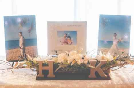 ウェルカムスペースには飾られていたのは、新婚旅行で行かれたハワイでのウェディングフォト! 真ん中の刺繍付きフレームは、新婦様が作成されたものだそうです! その前にあるイニシャル付きの造花は新婦様のお母様が作っていただいたものだそうで、手作りに溢れたとっても素敵なウェルカムスペースですね♪ ゲストの皆様もじっくりと楽しんでご覧になっていらっしゃいました。