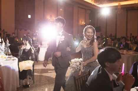 新婦様のカラードレスの色は披露宴再入場までシークレット。 扉が開きおふたりの姿が見えた瞬間、ゲストの方からは歓声が! 見事正解した方も外れてしまった方も、楽しそうにペンライトを振りおふたりを迎えていただきました♪ ペンライトとスポットライトに照らされ、カラードレスのグリッターがキラキラと光りとてもキレイでした!