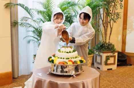 カレーが好きなおふたりがケーキの代わりにお選びいただいたのはカレータワー! 野菜で彩られ白米で作ったタワーへ、ケーキ入刀の代わりにカレールーをかけていただきました! ルーが衣装に飛んでしまうといけないので、事前にカッパを着せ合うとっても可愛いおふたりの姿も見られました♡ セレモニー後は小さなカレーライスを皆様へ提供させていただきました。 おふたりのオリジナリティ詰まった素敵な演出でした♪