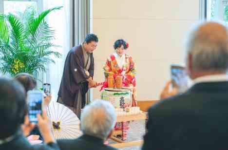 お色直しの衣装は家紋が入った紋付と、鮮やかな赤色の色打掛! 再入場後は鏡開きの演出を行われました。 酒樽の蓋の丸は夫婦円満を表現しており、蓋を叩いて開くことで、おふたりで未来を開いていくという意味が鏡開きには込められています。 ゲストの皆様もご一緒に掛け声をしてただき、大切なゲスト様に見守られながら綺麗に蓋が開かれました♪