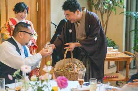 お色直し&鏡開き後、ゲストテーブルをまわりながら何かをゲストへお渡ししている新郎新婦様。 実は、先程の演出で使用した鏡開きの樽に入っているお酒を皆様にお配りしているんです! お酒が飲めない方にはお菓子の詰め合わせをお渡しし、どちらも嬉しいプレゼント♪ 新郎新婦様がゲスト1人ずつに直接お配りすることでコミュニケーションもしっかり取れ、お気持ちが伝わる温かい歓談のお時間となりました!
