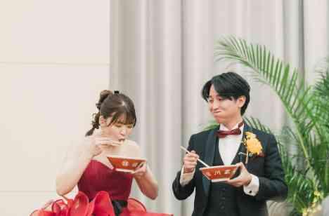 結婚祝いに名入りのどんぶりをご友人にプレゼントされるほどのラーメン好きなおふたり。ラーメン大好きなおふたりらしく、披露宴ではラーメンビュッフェを実施。会場も期待に包まれました。まずはおふたりが見本として一杯を仕上げ、笑顔で実食。その後ゲストの皆様へ提供され、湯気とともに歓声が広がります。遊び心とおもてなしが詰まった、記憶に残る演出となりました。