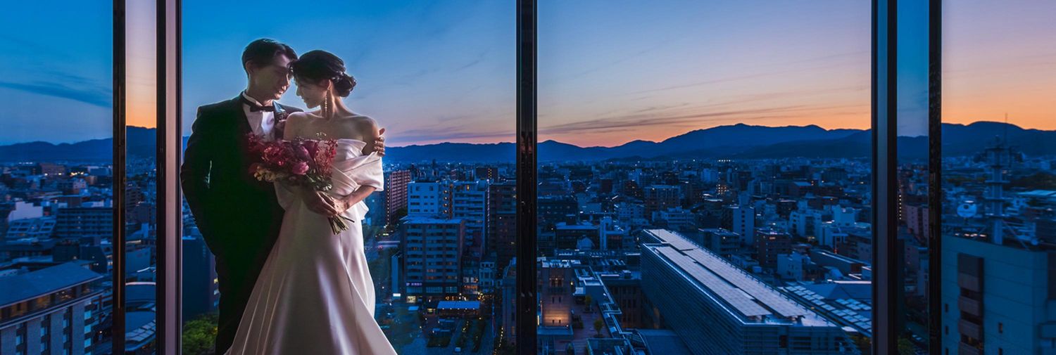 - 開放的な窓から望む京都の街並みを借景に、地上60mでの愛の誓いはドラマチックでゲストからの歓声が