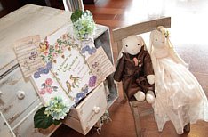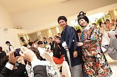 新婦様一番のこだわりが衣裳。ウェディングドレスは袖の長いアンティークな雰囲気のものをご希望されていました。試着でイメージにあう一着を見つけられすぐにご決定。またお色直しはお母様のご希望でもあった和装に。古典柄でイメージにぴったりの色打掛にご決定されました。ヘアメイクも、クラシカルなボンネでの挙式から、生花の大きなヘッドパーツでのパーティ入場、さらに和装では黒髪ウィッグでイメージチェンジされました。