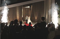 挙式は今まで歩んできた軌跡をテーマにした、Mia Viaオリジナル「ノティ式」を選ばれました。ライトアップが幻想的な雰囲気を創りだし、昼間とは異なる表情のチャペルでの厳粛な挙式となりました。式後は、チャペル前で華やかに花火をあげてのアフターセレモニーを行いました。秋風が心地よく吹く中での祝砲に、ゲストからは祝福と驚きの歓声がわき上がりました。