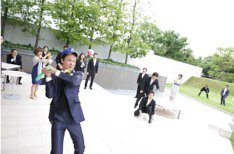 ソフィ邸の広大なテラスに一目惚れし、MiaViaでの結婚式をご決定されたおふたり。大好きなテラスでゲストと一緒に楽しめる演出を考えられました。まずは、女性参加のブーケトス♪女性のみの演出があるなら、男性のみの演出も行わないとということで、担当プランナーと考えた演出が「野球ボールトス」!新郎様の特技を活かした演出で、とても盛り上がるパーティとなりました。