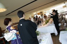 新婦様が着付けを習っていらっしゃったことから、挙式後に和装へお色直しをしての入場に。妹さんの乾杯の発声に始まり、お母様によるラストバイト、お父様のサックス演奏。家族みんなが主役のパーティとなりました。親族の顔合わせも兼ねていたので、会場のレイアウトは1本のテーブルをゲストで囲む形にして、全員がお互いの顔を見える形に。会話が弾み、笑顔が広がるひとときとなりました。