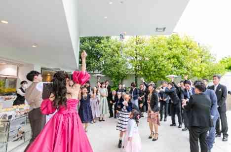 堅苦しさ無しでとにかく楽しく過ごしたいという想いから、「全員参加」をキーワードに、さまざまな演出を盛り込まれました。サプライズでリングボーイとリングガールを指名したり、広いテラスで菓子まきをしたり、ウェルカムパーティを取り入れたり・・・とゲスト目線を大切にされていたのが印象的。お写真を撮ったり話したりという時間も大切に過ごされました。