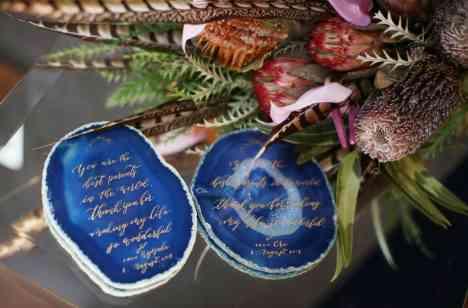 ゲストとの絆を深めたいというおふたりの想いから、Wテーマはアゲート(絆を深める石)に。席札も石にして、カリグラフィー文字で手書きしていました。人前式で使用したふたりの誓いの言葉も石に刻まれたものを用いるなど、テーマに沿ったアイテムで全体的に統一感をだしました。