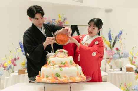 ウェディングケーキの代わりに登場したのは、なんと大迫力の「お寿司タワー」!いくらを豪快にかける独創的な演出に会場は大盛り上がりでした。また、新郎様のルーツである「餅まき」をアレンジした「お菓子まき」では、ゲスト全員が童心に帰って楽しまれる姿が印象的でした。お互いを想い合ったサプライズもあり、お二人の「楽しんでもらいたい」という純粋な想いが、ゲスト全員に届いた最高の演出となりました。