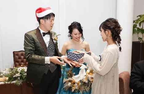 用意した引出物の中から【ゴールド】のグラスが入った方にプレゼントBOXをお渡ししました!! 中を開けると、プレゼントと一緒になにやらもう一つBOXが・・・ そこに書かれていたのが【この会場の中で一番お酒が強そうな方】 その方にBOXをお渡しするとさらに一回り小さなBOXが・・・ そんなリレー方式でプレゼントをお渡ししました。