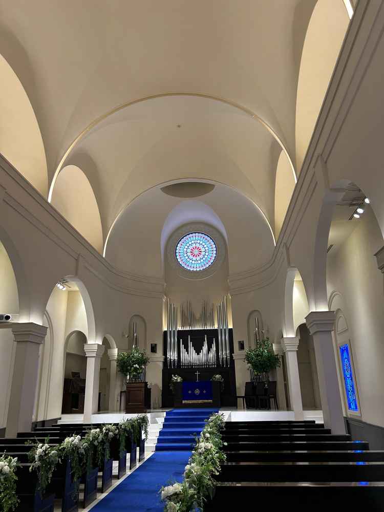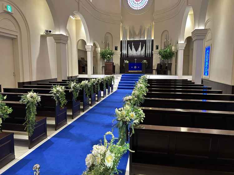 青色のバージンロードがとても素敵でした。また、緑豊かで住宅街とは思えない空気感でした。天井も高く明るかったです。