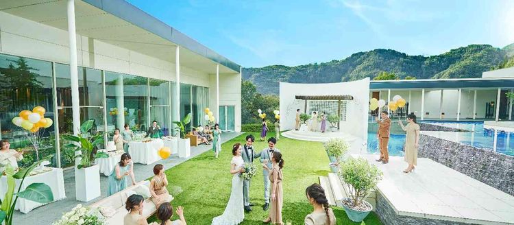 緑と滝が臨めるロケーションでガーデンウエディング