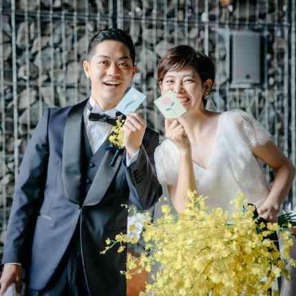 ガーデンセレモニーでは、 おふたりから特別なおもてなしをご用意。 新郎様が手にされているのは、 実はブーケではなく“カップ麺ブーケ”!! ゲストの皆さまに楽しんでいただきたいという想いを込めて、 ご準備