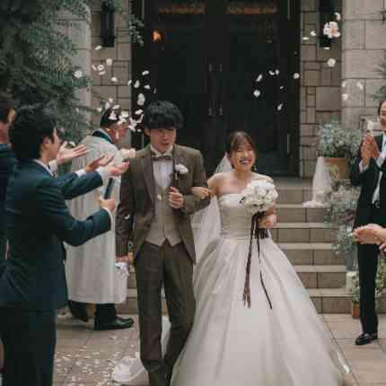 ステンドグラスが光り輝くチャペルで 大切な方々に見守られて執り行われた挙式 退場時にはゲストの皆さまから祝福のフラワーシャワーが降りそそぎ笑顔があふれる幸せなひとときときでした 祝福の拍手や歓声に包ま