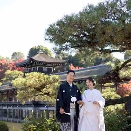 平安神宮の歴史に見守られながら執り行われた神前式。白無垢と紋付袴に身を包んだおふたりの姿は、平安神宮の佇まいと美しく調和し、列席されたゲストの心にも深く残る光景に。儀式の一つひとつを丁寧に進められるお