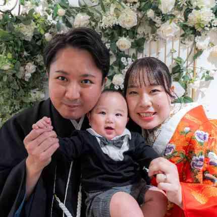 お二人のタキシードとドレス姿を両家の親御様へご披露する「ファミリーミート」! 挙式では、新郎様はお母様からのジャケットセレモニーに始まり、7ヶ月になるお子様を抱っこしながらご入場。 新婦様は笑顔でお父