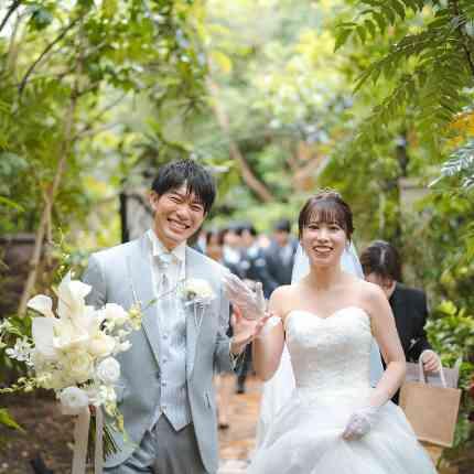森のチャペルで感動的な挙式が結んだあとは笑顔溢れるフラワーシャワーのお時間!大宮璃宮は広大な敷地だからこそ披露宴会場のガーデンとは別に庭園があるため、そこでおふたりはブーケトスのセレモニー!ブーケトス