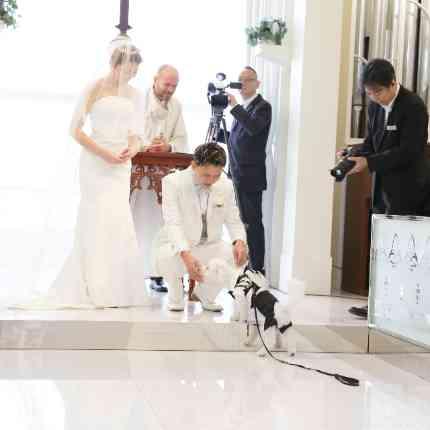 挙式では大切な家族の一員であるおふたりの愛犬がリングドッグとして登場。一生懸命に指輪を届ける姿に会場からは自然と温かな拍手と笑顔が広がります。更に披露宴の入場ではおふたりと愛犬がお台場のロケーション望