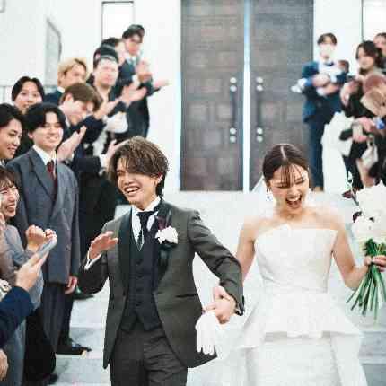 皆様の前で愛を誓われたおふたりは、挙式後。 祝福のフラワーシャワーでの退場。 そしてご友人様による巨大クラッカー発射!! ゲストの皆様も巨大クラッカーの迫力に大盛りあがり! 挙式での感動をそのままにバ
