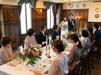本当に身近な人だけに囲まれて、一人ひとりに「ありがとう」を伝える少人数の温かなパーティ。全員で同じテーブルにつくスタイルも可能です。邸宅貸切だからこそ、おいしい料理と和やかな会話でくつろぐ時間も特別なものに。一組一組に合わせた空間づくりを提案します。