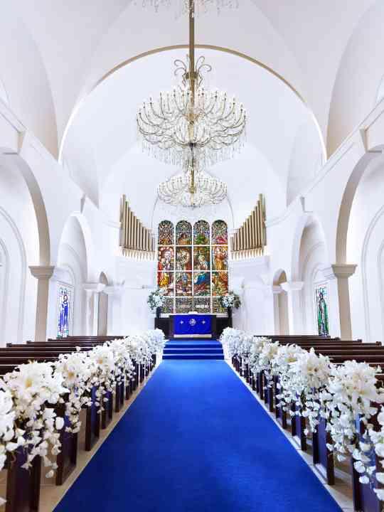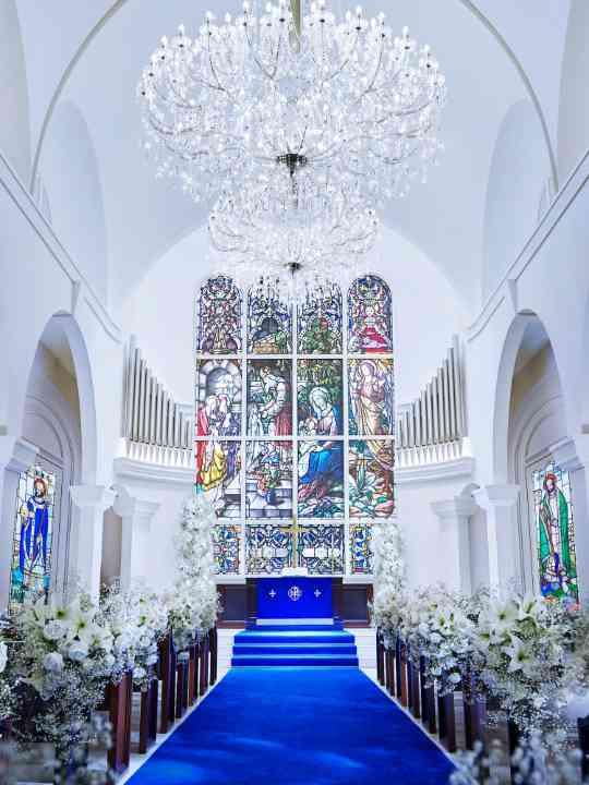大聖堂チャペルは、キリスト教の本格大聖堂の雰囲気を受け継ぐ正統派チャペルで、高い天井と長いバージンロード、幻想的なステンドグラスなど、贅沢な装飾と空間使いが特徴です。