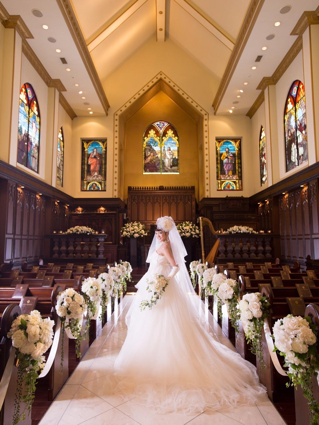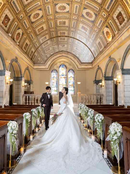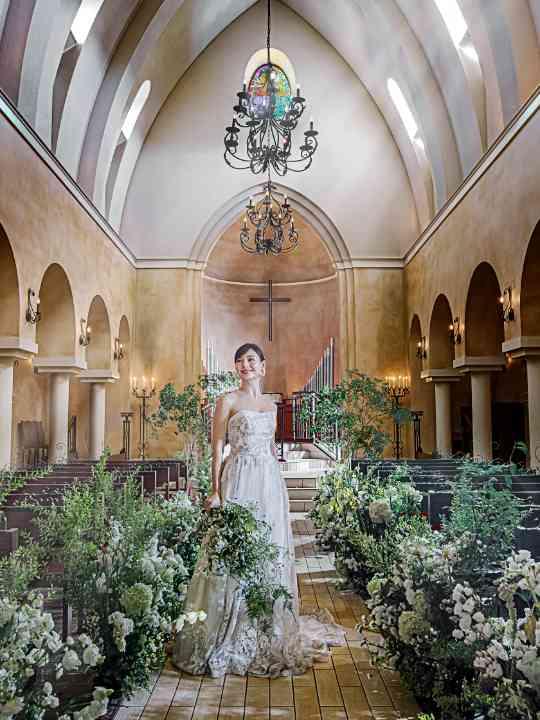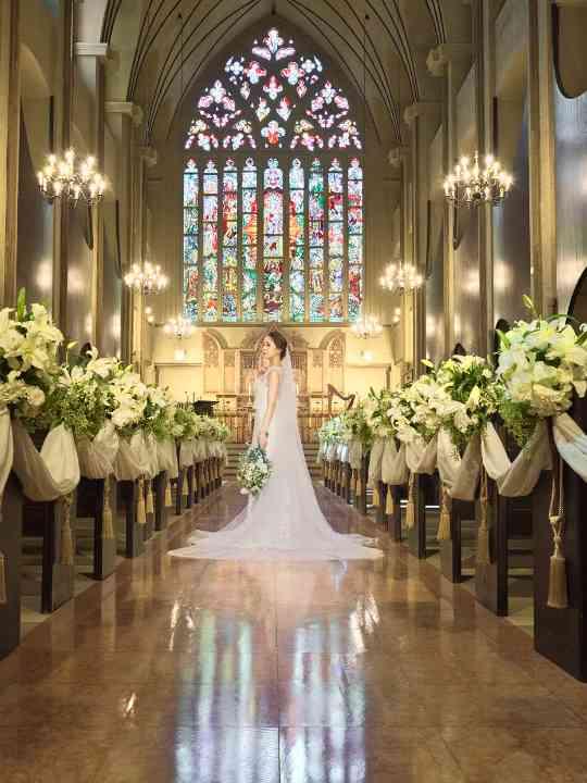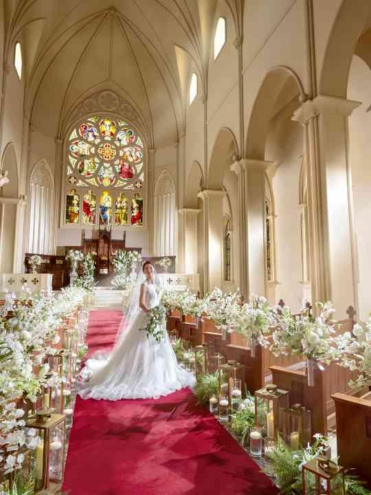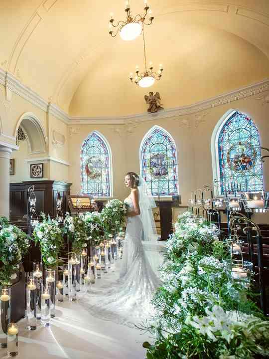 華やかなプリンセスラインのドレスはもちろん、マリアベールやエンパイアラインのクラシカルなウエディングドレスも大聖堂チャペルにぴったり。