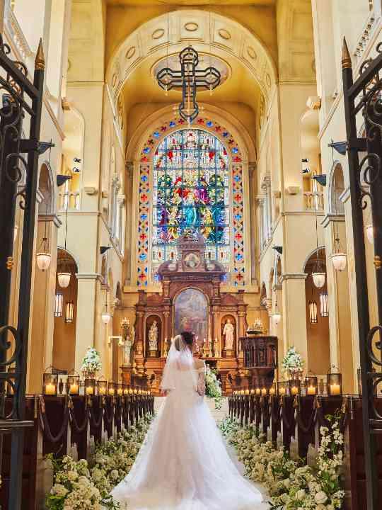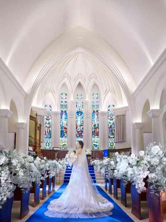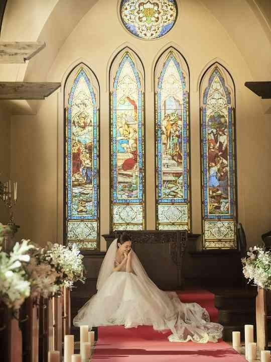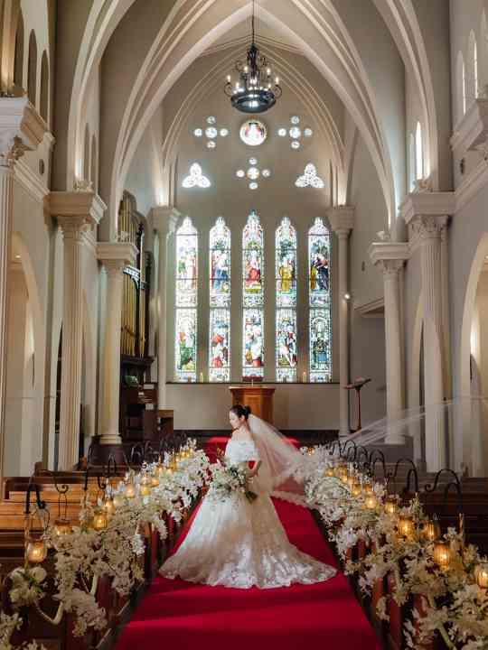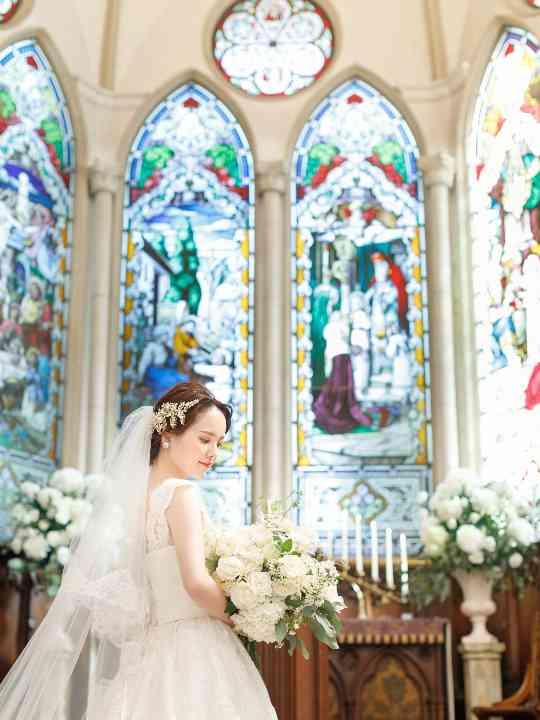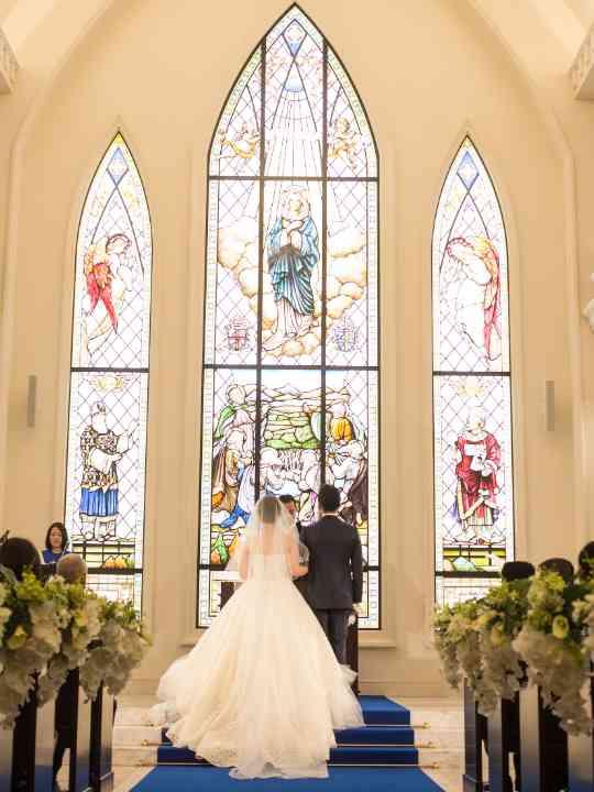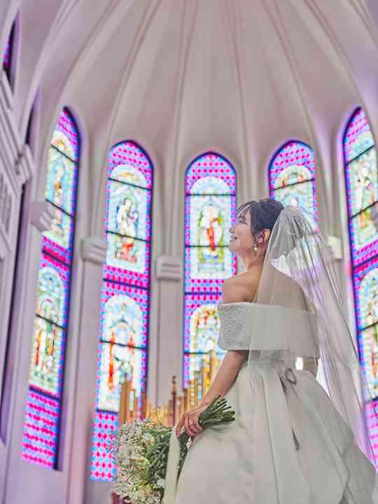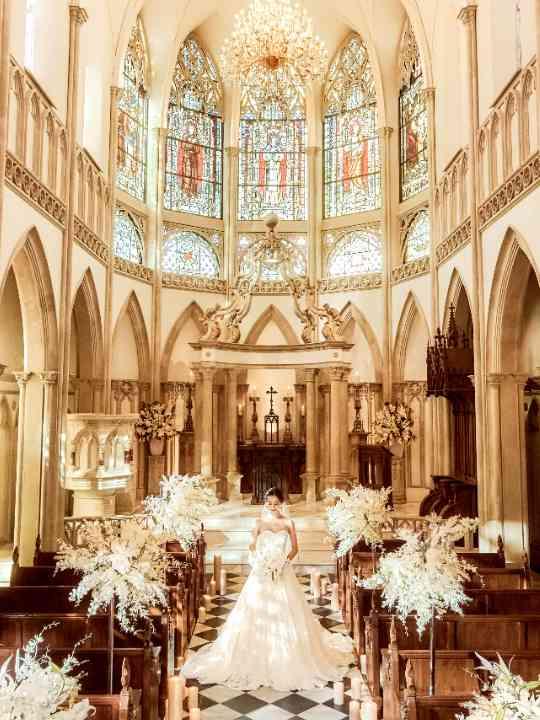 華やかなプリンセスラインのドレスはもちろん、マリアベールやエンパイアラインのクラシカルなウエディングドレスも大聖堂チャペルにぴったり。