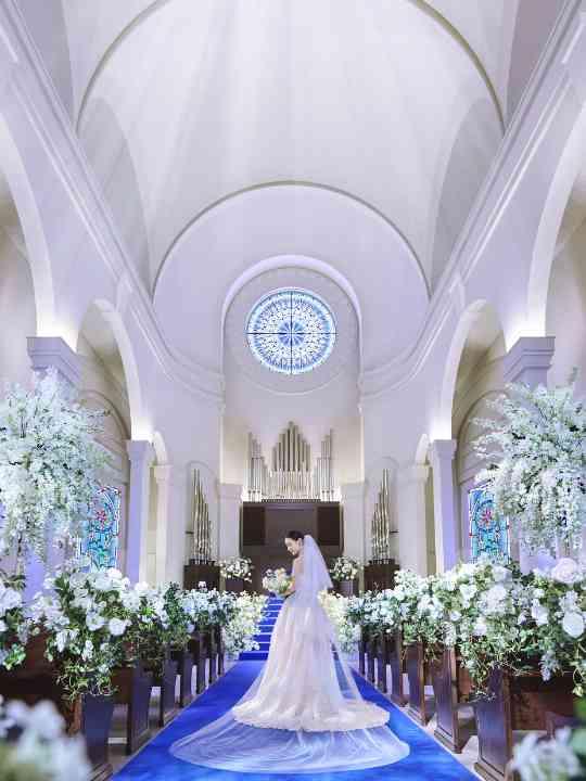 純白のウエディングドレスをまとった花嫁を美しく引き立てるバージンロード。