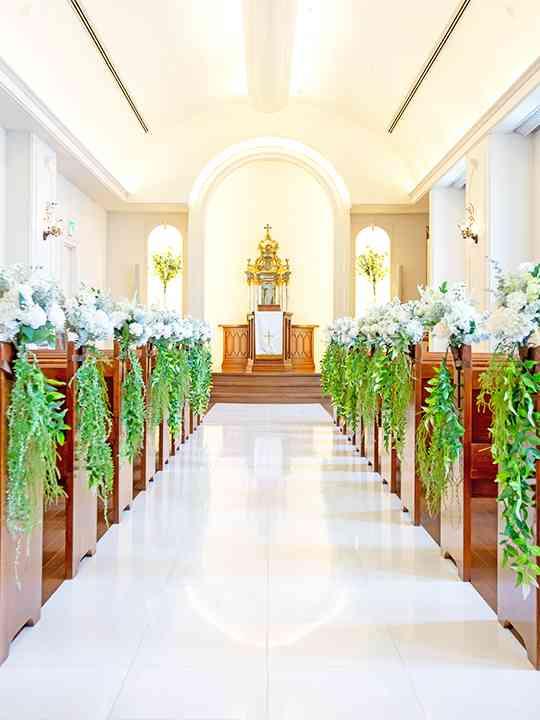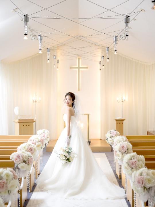 「バージンロードや壁、天井など、すべて真っ白なチャペルはアレンジが自由自在。