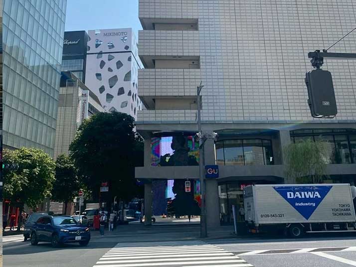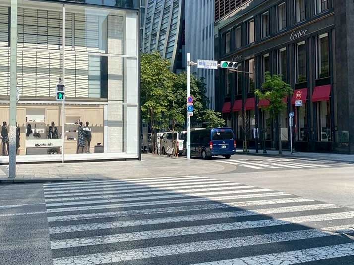 02 銀座二丁目の交差点を、中央通りを超える形で横断歩道を渡ります。